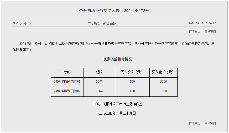 業(yè)內(nèi)人士表示,上述操作是對到期特別國債進(jìn)行的常規(guī)續(xù)作,由財(cái)政部先發(fā)行4000億元特別國債,之后央行以數(shù)量招標(biāo)方式全額買入,符合此前慣例,與市場此前預(yù)期的一般性國債操作并不相同,對流動(dòng)性也幾乎沒有影響。