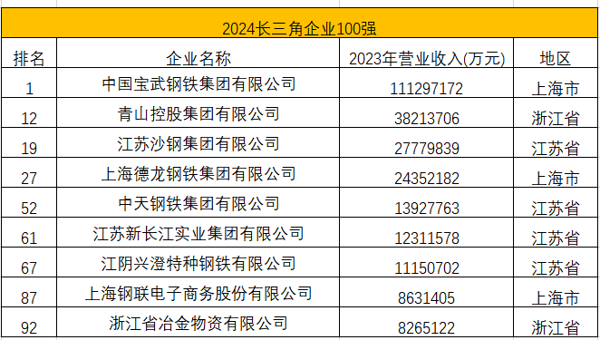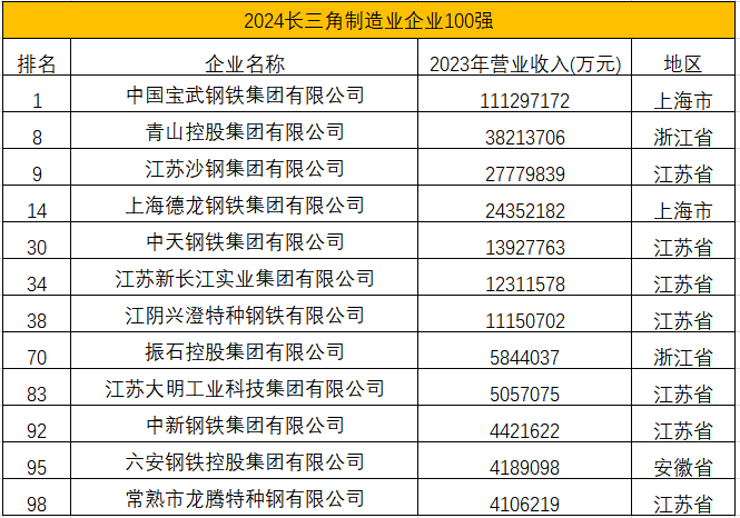 中國寶武、青山控股、沙鋼集團(tuán)等多家鋼鐵及相關(guān)企業(yè)進(jìn)入2024長三角企業(yè)100強(qiáng)和2024長三角制造業(yè)企業(yè)100強(qiáng),具體名單如下: