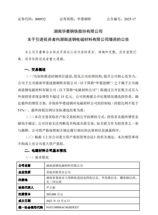華菱鋼鐵3月16日晚公告,為加快推進(jìn)硅鋼項(xiàng)目建設(shè),公司子公司湖南華菱漣源鋼鐵有限公司(簡(jiǎn)稱“華菱漣鋼”)之下屬子公司湖南漣鋼電磁材料有限公司(簡(jiǎn)稱“電磁材料公司”)擬通過(guò)公開(kāi)征集方式引入外部投資者現(xiàn)金增資不超過(guò)15億元。公司將根據(jù)公開(kāi)征集情況遴選投資者,確定最終的增資方案,并保持華菱漣鋼對(duì)電磁材料公司的控制權(quán)(持股比例不低于51%),最終持股比例以實(shí)際遴選結(jié)果為準(zhǔn)。