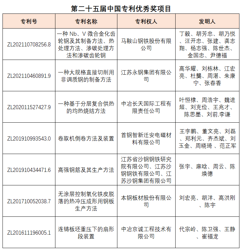 近日,國家知識產(chǎn)權(quán)局發(fā)布《國家知識產(chǎn)權(quán)局關(guān)于第二十五屆中國專利獎授獎的決定》。第二十五屆中國專利獎共評選出中國專利金獎獲獎項目30項,中國外觀設(shè)計金獎獲獎項目10項,中國專利銀獎獲獎項目60項,中國外觀設(shè)計銀獎獲獎項目15項,中國專利優(yōu)秀獎獲獎項目607項,中國外觀設(shè)計優(yōu)秀獎獲獎項目47項。鋼鐵相關(guān)領(lǐng)域7項專利榮獲第二十五屆中國專利優(yōu)秀獎,名單如下: