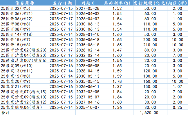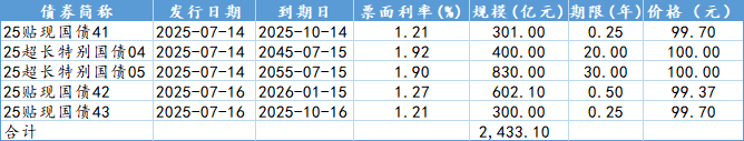 具體來(lái)看,國(guó)債方面,財(cái)政部上周發(fā)行5只國(guó)債,環(huán)比減少1只,發(fā)行規(guī)模共2,433.10億元,環(huán)比減少499億元。從具體品種來(lái)看,上周財(cái)政部發(fā)行了3只貼現(xiàn)債和2只超長(zhǎng)期特別國(guó)債(下表)。