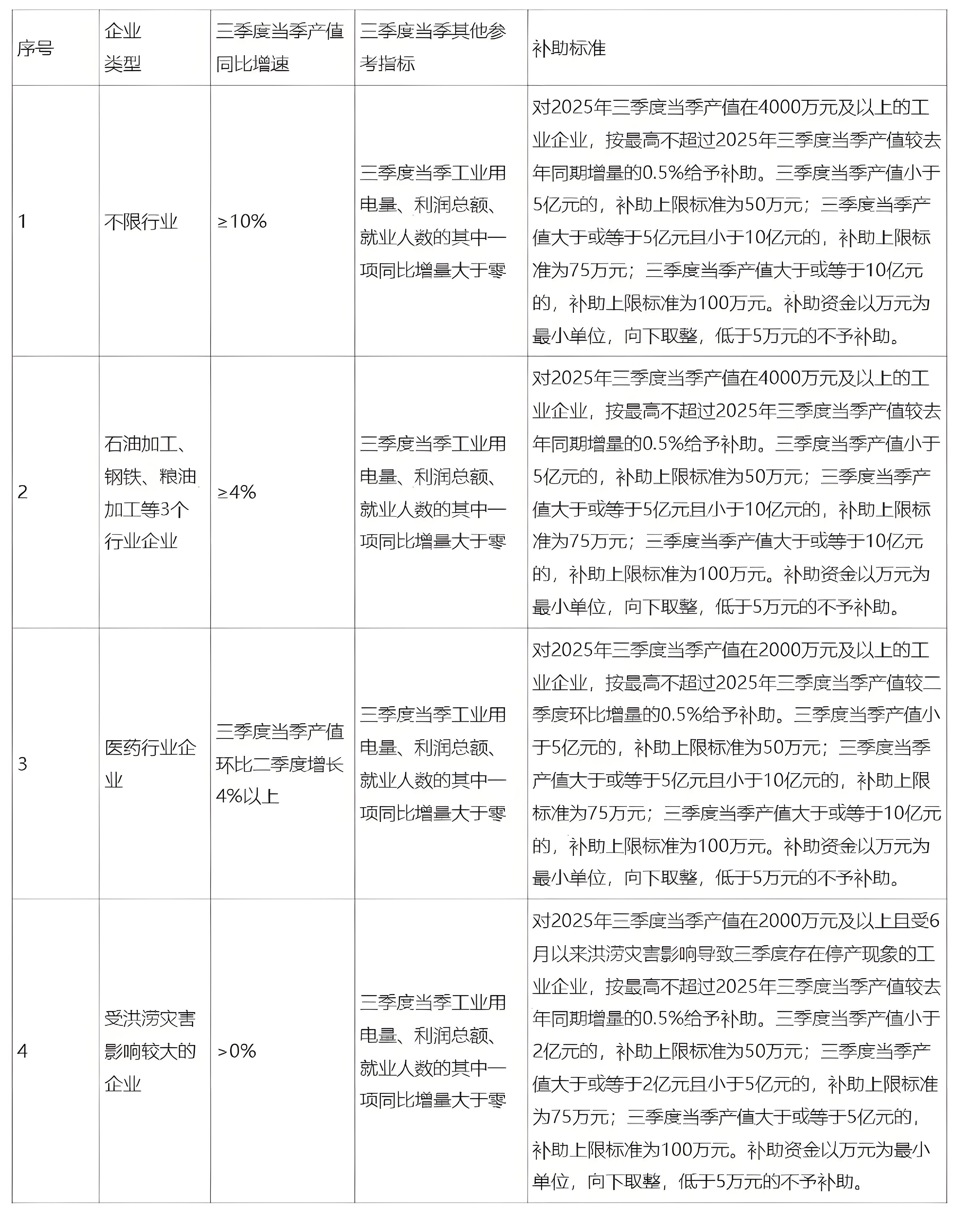 根據(jù)企業(yè)2025年三季度當(dāng)季產(chǎn)值、工業(yè)用電量、利潤總額、用工人數(shù)等指標(biāo)情況,分行業(yè)分類給予企業(yè)一定的資金獎補(如下表),用于支持企業(yè)增加用工、采購生產(chǎn)物料、降低物流成本和加強安全生產(chǎn)等。注:以下各項不得重復(fù)申報,補助標(biāo)準(zhǔn)為上限標(biāo)準(zhǔn)。