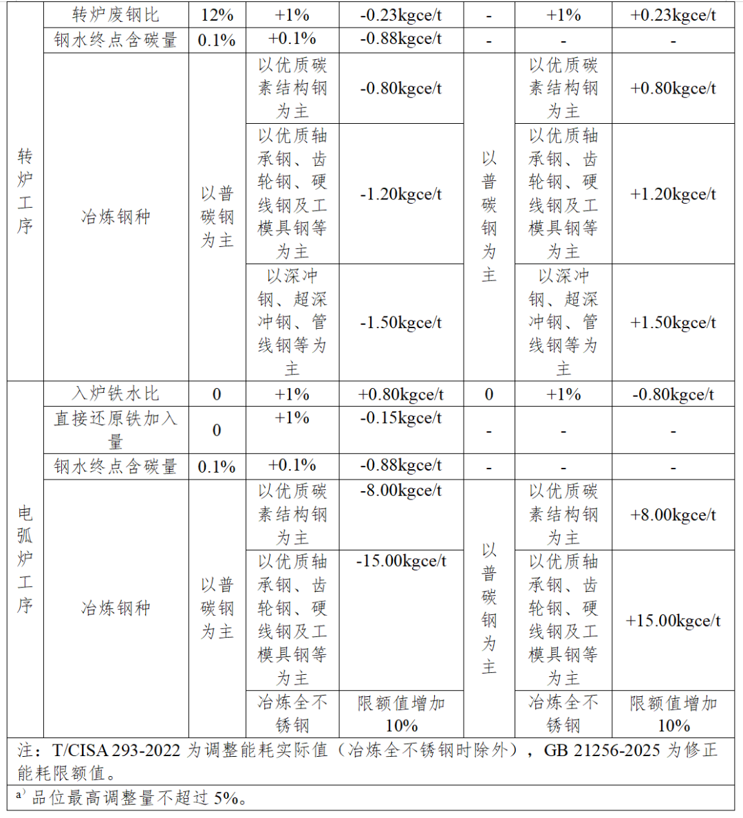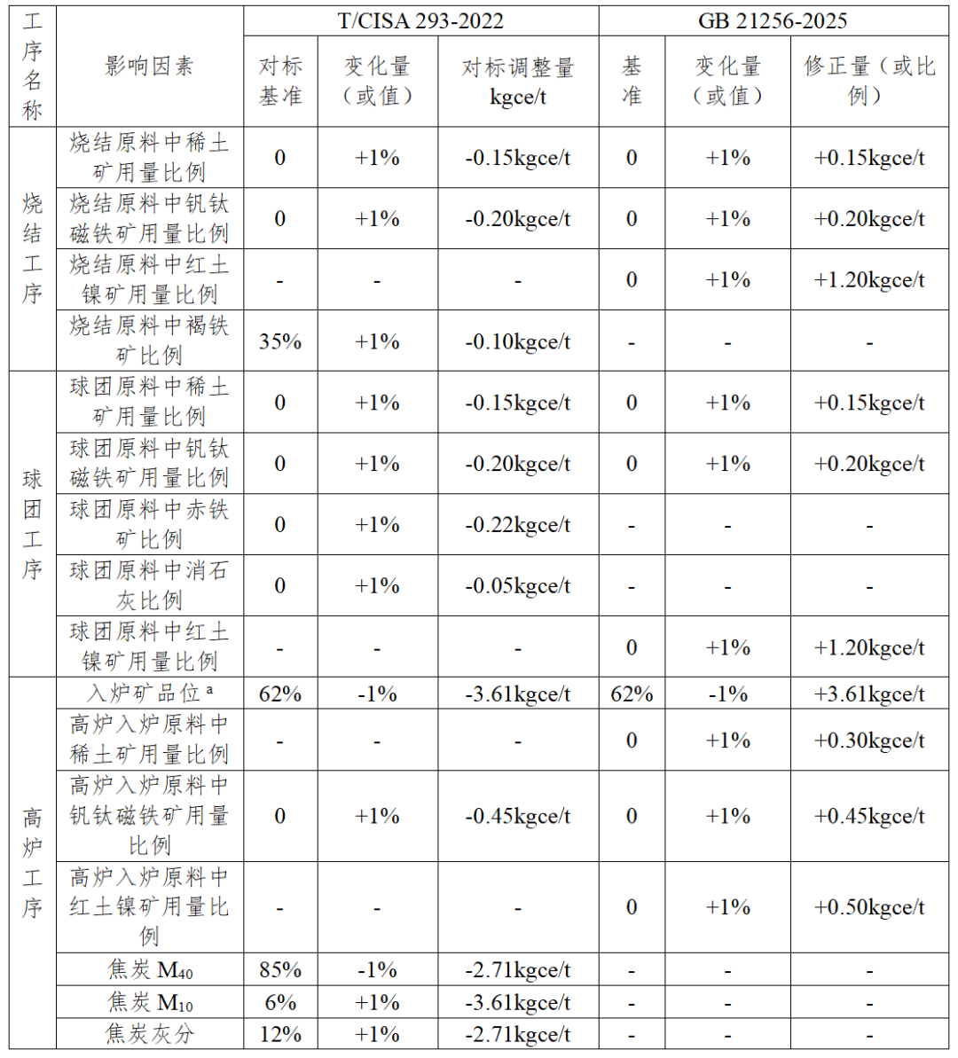 2025版充分采納了T/CISA 293-2022的技術要求,結合鋼鐵工業(yè)極致能效工程推進過程中的實際問題,對鋼鐵原料品質變化、鋼產品質量升級等導致能耗增加的客觀因素進行了修正,詳見附表。