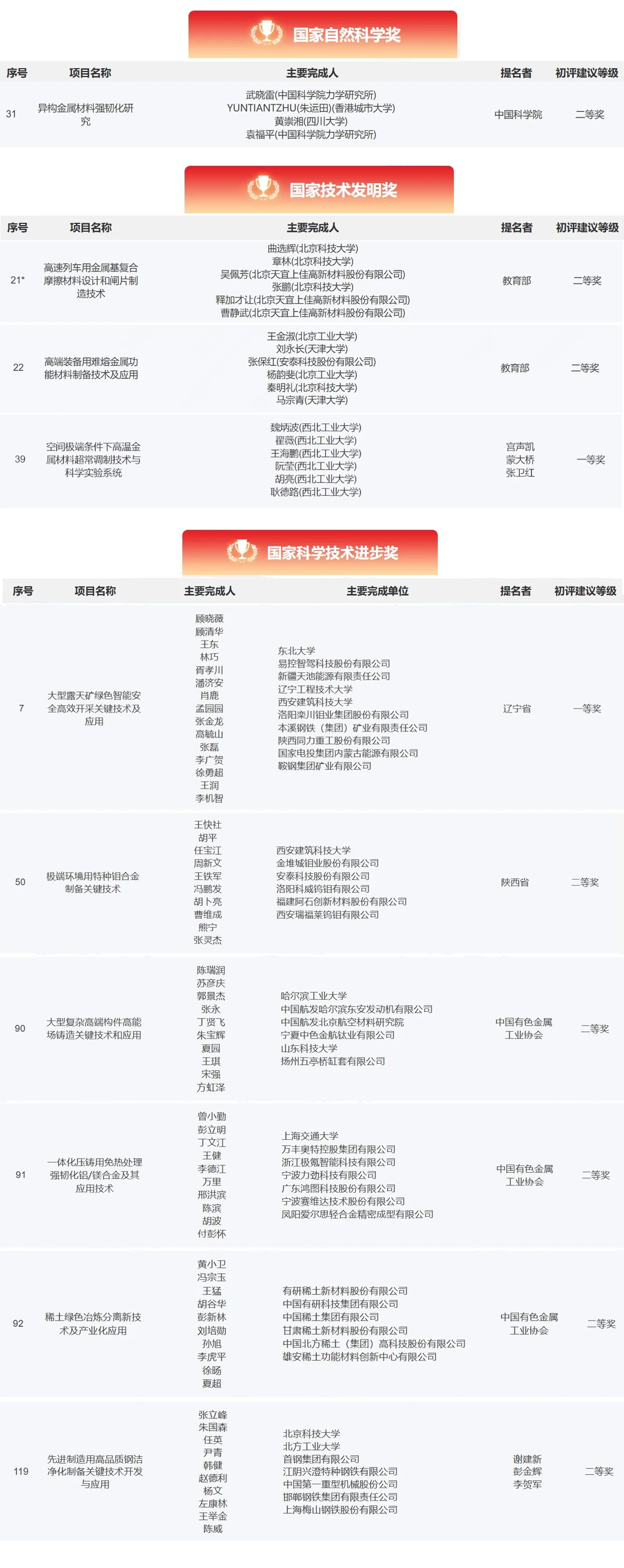 9月22日,科技部官網(wǎng)發(fā)布《國家科學(xué)技術(shù)獎勵工作辦公室公告第103號》。公告顯示,2025年度國家科學(xué)技術(shù)獎初評工作已經(jīng)結(jié)束?,F(xiàn)將通過初評的60項國家自然科學(xué)獎項目、51項國家技術(shù)發(fā)明獎通用項目、134項國家科學(xué)技術(shù)進步獎通用項目,在國家科技管理信息系統(tǒng)公共服務(wù)平臺(https://service.most.gov.cn/jl)公示。其中,涉及鋼鐵相關(guān)領(lǐng)域的國家自然科學(xué)獎項目共1項、國家技術(shù)發(fā)明獎3獎、國家科學(xué)技術(shù)進步獎項目5項!