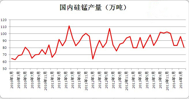 2014年4月國內硅錳產量為80.78萬噸,較之3月(95.9萬噸)有所下降,較之2013年4月(78.58萬噸)略有增加,2014年1-4月累積硅錳產量344.1萬噸,較之2013年1-4月(330.7萬噸)略增加。
