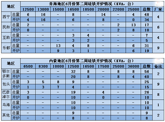 Mysteel調(diào)查青海、內(nèi)蒙地區(qū)本周硅鐵開(kāi)爐情況,共取樣40余家中大型硅鐵生產(chǎn)企業(yè),總計(jì)229臺(tái)硅鐵礦熱爐,投產(chǎn)165臺(tái),開(kāi)工率在65%。其中,青海地區(qū)共計(jì)103臺(tái)礦熱爐,投產(chǎn)72臺(tái),開(kāi)工率在64%,內(nèi)蒙共計(jì)126臺(tái)礦熱爐,投產(chǎn)89臺(tái),開(kāi)工率66%。
