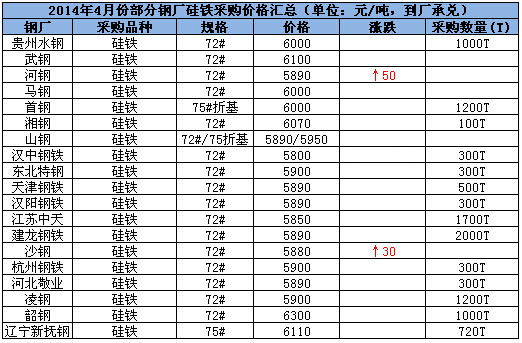 截止于2014年6月13日,Mysteel國(guó)標(biāo)硅鐵價(jià)格匯總:本周主產(chǎn)區(qū)75#硅鐵市場(chǎng)報(bào)價(jià)小幅上漲,且市場(chǎng)庫(kù)存較少。各地區(qū)報(bào)價(jià)如下:寧夏地區(qū)75#、72#報(bào)價(jià)報(bào)在5800元/噸,5550元/噸,本周盤(pán)整;甘肅地區(qū),75#報(bào)在5800元/噸,72#報(bào)在5550元/噸,盤(pán)整;青海方面,72#硅鐵鐵承兌報(bào)價(jià)在5450元/噸,已上調(diào)趨勢(shì),75#承兌報(bào)價(jià)在5750元/噸,上調(diào)50元/噸;內(nèi)蒙地區(qū),72#、75#硅鐵,分別報(bào)價(jià)在5600元/噸,5850元/噸,上調(diào)50元/噸。