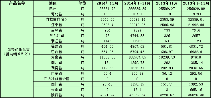 據(jù)數(shù)據(jù)顯示:2014年11月份國內(nèi)鉬精礦總產(chǎn)量25661.92噸(折純鉬45%),較去年11月份總產(chǎn)量25509.27噸,同比增長0.6%;較今年10月份總產(chǎn)量25730.98噸,環(huán)比減少0.3%;2014年1-11月累計生產(chǎn)鉬精礦總產(chǎn)量266689.89噸,較去年1-11月總產(chǎn)量256029.09噸,同比增長4.2%。