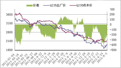 截至8月7日唐山地區(qū)鋼坯測算成本價為2073元/噸,出廠價為1870元/噸。出廠價格與測算成本之間差價203元,近期鐵礦石價格仍然維持高位,鋼坯出廠價格相對較低,鋼廠仍倒掛嚴重。